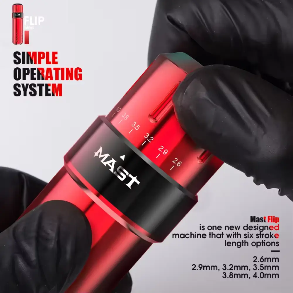 Pen MAST Flip Rotary doskonale sprawdza się przy różnych technikach tatuażu, w tym pigmentacji, cieniowaniu i kolorowaniu. Dzięki nowatorskiej konstrukcji wnętrza, artysta może regulować skok igły bez przerw w pracy, co zapewnia płynność procesu tatuowania.